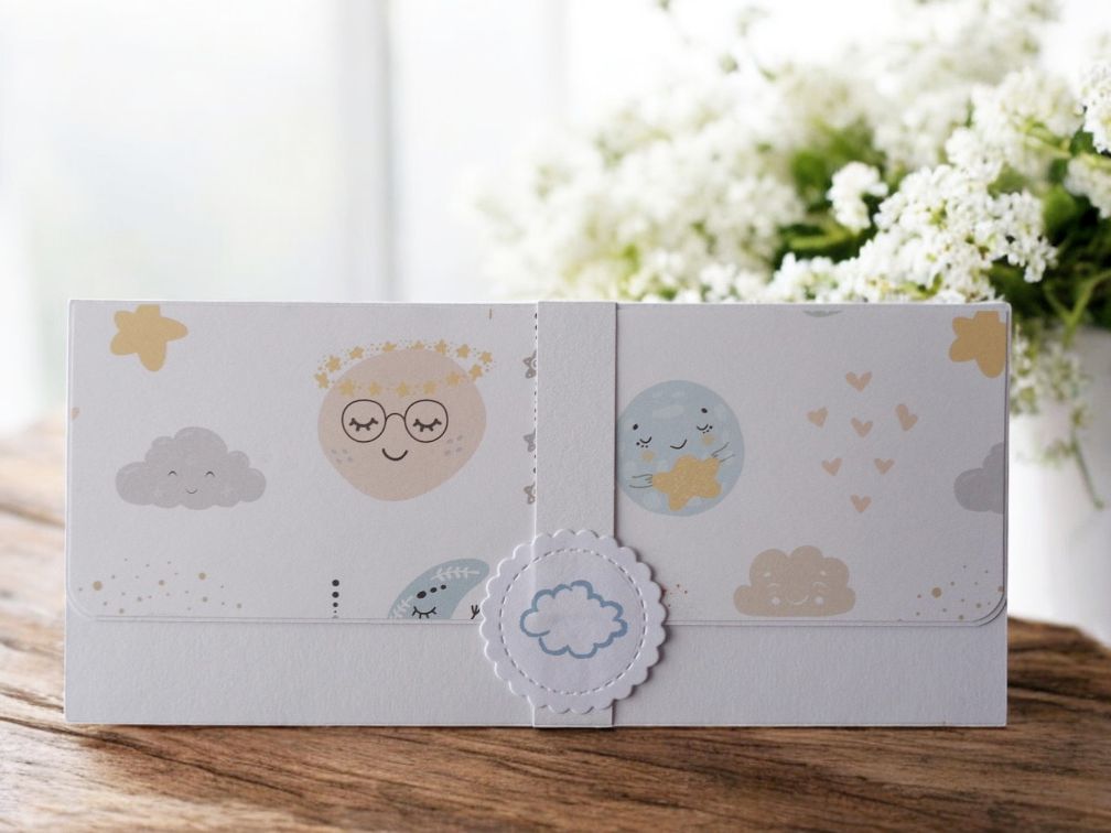 Něžná darovací obálka na peníze s univerzálním designem vhodným pro oslavu narození miminka.