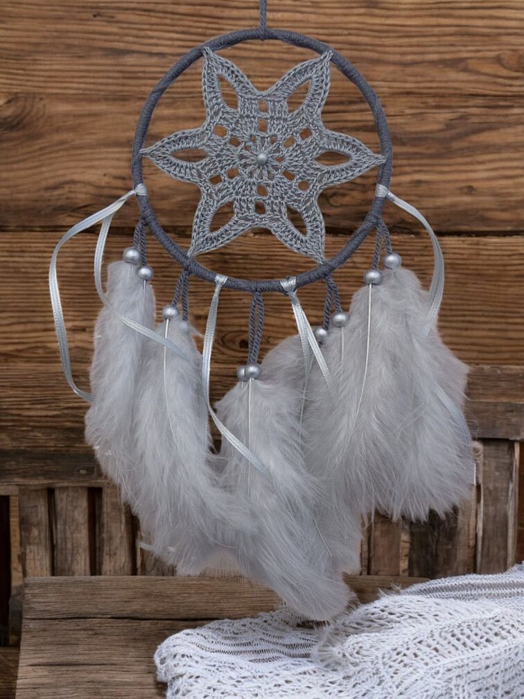 Háčkovaný střed s jemnými peříčky dodávají lapači romantický a vzdušný vzhled.