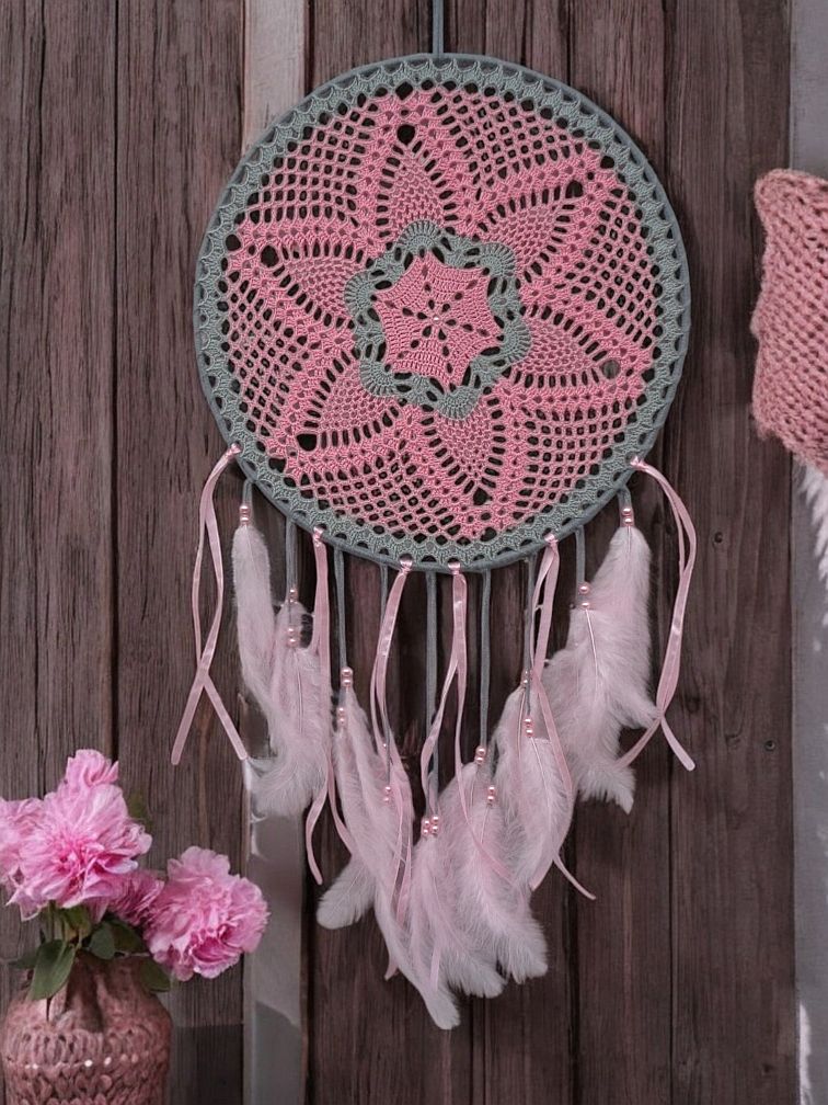 Jemný a esteticky působivý lapač snů, který kombinuje ručně háčkované detaily s lehkými peříčky.